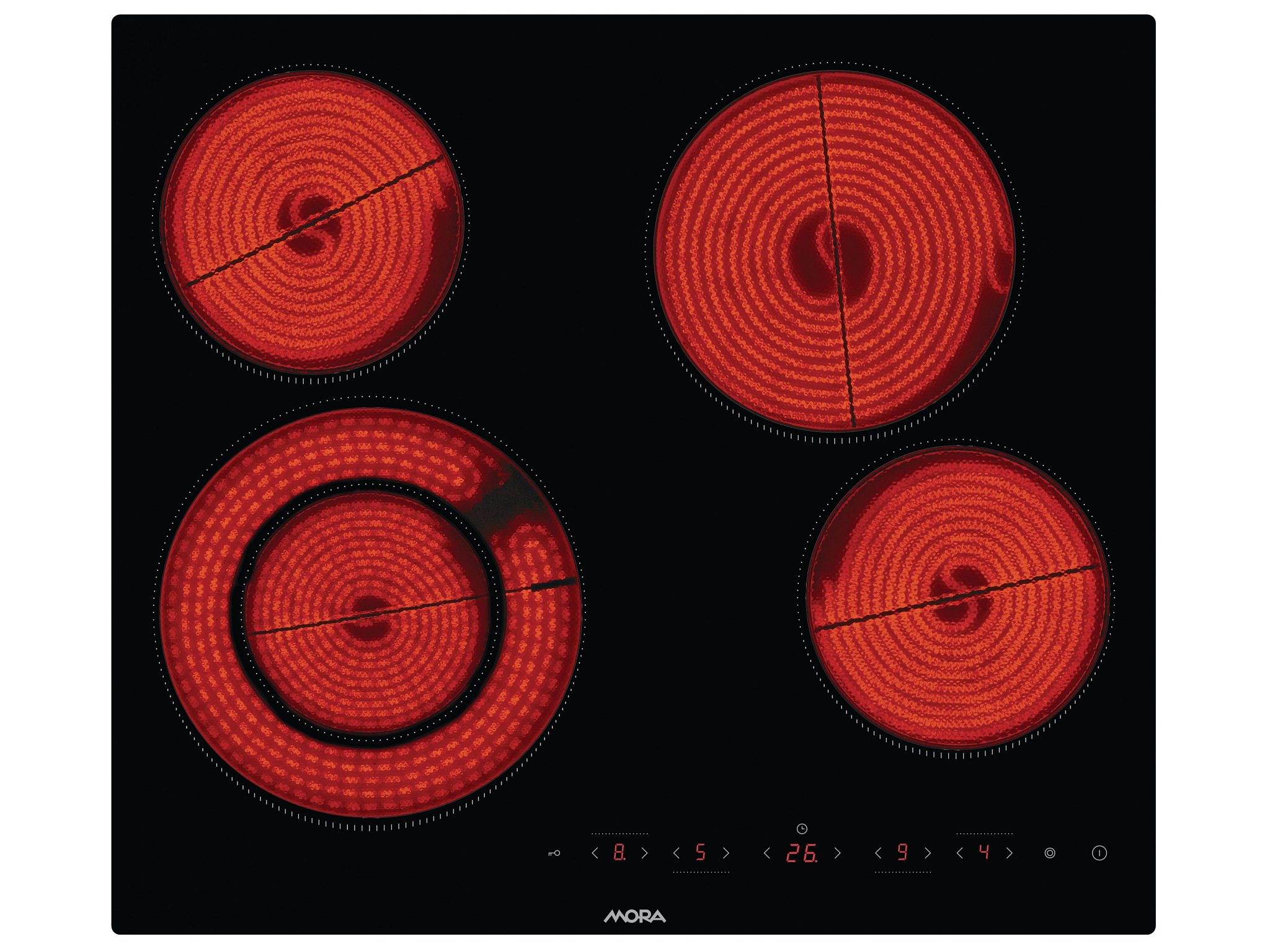 Sklokeramická varná deska MORA VDST 632 C v černém provedení s praktickými broušenými hranami, díky čemuž ji lze jednoduše zabudovat i do roviny s pracovní deskou, disponuje 4 Hi-Light varnými zónami. S ukazatelem zbytkového tepla na desce víte, která zóna je ještě horká a jste tak chráněni před nepříjemným popálením a jinými nehodami. Taky můžete využít zbytkového tepla pro rozmrazovaní nebo ohřev uvařeného jídla. Dotykové ovládání s plynulou regulací výkonu se zvukovým signálem bylo navrženo tak, aby zabíralo minimum místa, ale stále Vám poskytovalo dokonalý přehled o stavu vaření. Sklokeramický povrch se velmi snadno čistí, stačí jej otřít a varná deska je opět čistá bez námahy a pohodlně. Funkce KeyLock je vytvořena speciálně pro rodiny s malými dětmi. Nechat děti v kuchyni bez dozoru nebylo nikdy bezpečnější, protože tato možnost jim zamezuje zapnout varní desku. Funkce Timer vám umožní nastavit dobu vaření až na 99 minut. Pokud znáte optimální dobu vaření pro konkrétní jídlo, můžete nastavit časovač a varná deska se po uplynutí nastavené doby automaticky vypne. Pípnutí signalizuje, že je jídlo připravené.